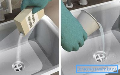 Potrebno je sipati oba sastojka u otvore za odvod, zatim izliti veliku količinu vode za kuhanje i ostaviti sve 8-10 sati. Za to vreme, tečnosti ili druge supstance treba izbjegavati.