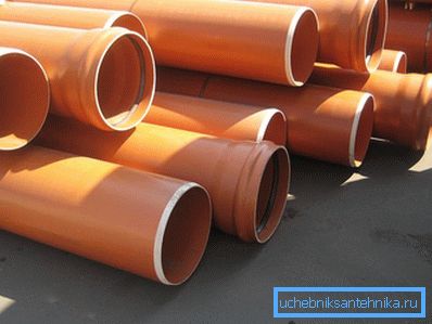 Za spoljnu kanalizaciju koriste se proizvodi od polivinilhlorida. Ovo su narandžasti PVC cevi. Savršeno izdržavaju agresivne efekte životne sredine, imaju glatku unutrašnju površinu (koja sprečava blokadu) i dug životni vek. Ali takve cevi ne tolerišu visoke temperature. Ako u kanalizacijama preovlađuju tečnosti sa temperaturom iznad + 40 ° C, vijek trajanja proizvoda je znatno smanjen.