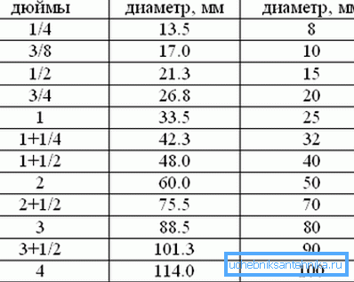 Obratite pažnju! Vrlo često se javljaju pitanja kada je potrebno spojiti metalne i plastične cijevi, s obzirom na veličinu nekih od inča, a druga na milimetre. Da biste pojednostavili ovu proceduru, možete koristiti tabelu ispod. Dakle, lako možete saznati koje proizvode stečite, kako biste bili u skladu sa svim parametrima komunikacije.