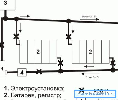 - Ugradnja glavnih podizača i priključaka na radijatore. U prvom slučaju, delovi se koriste u veličinama od 32 do 40 mm, u drugom - od 20 do 24. Priključivanje sa radijatorima vrši se pomoću specijalnih sgona - "američkih žena". Šema povezivanja može biti različita. To zavisi od površine zagrejanih prostorija i ukupne dužine cevovoda za grejanje.