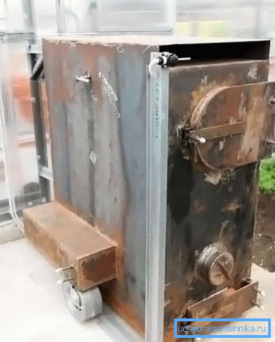 Spoljni zidovi bojlera su obloženi metalom, koji se međusobno povezuje uglovima postavljenim vertikalno. Vrata su pričvršćena za metalno kućište. Za uklanjanje montiranog dimnjaka ugljen-monoksidnih gasova. Kako instalirati ovaj čvor zavisi od prisustva ili odsustva površine za kuvanje.