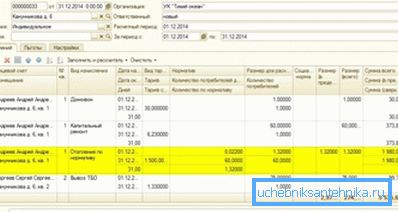 Sledeća i završna faza je trošak, tj. Ovde ćemo već znati cijenu ili iznos iznosa koji trebamo platiti za ovu uslugu. Ne zaboravite da je to moguće u prisustvu dva uređaja - ODPU i IPU. U ovom slučaju koriste se komunalije / Dokumenti / Obračun / Raspodjela komunalnih usluga.