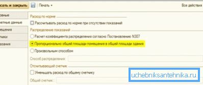 Na referentnoj knjizi koja nam je poznata, označavamo vrijednost vrijednosti Generalne kuće, to jest, ovdje mislimo na ODPU. Nakon toga, u meniju Izračunane podatke, potrebno je prilagoditi potrošnju prema stavci Proporcionalno na ukupnu površinu sobe u ukupnoj površini zgrade.