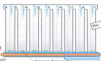 Zbog činjenice da cevi imaju nizak pritisak, sekundarni nosač toplote buši se na temperaturi od 35 ° C. Zbog toga, čim temperatura u donjoj cevi dostigne 35 ° C, tečnost litijum-bromida počinje da vrea, podiže se. Dakle, počinje da se kondenzuje na unutrašnjim zidovima radijatora, prenoseći toplotu na njih, koja se distribuira preko površine uređaja.