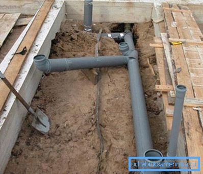 Nakon toga, merdevina je priključena na kanalizacionu cev kroz tranzicionu cev i odvodnjavanje, vrijeme je da se napravi gruba kravata. Pri izgradnji drenažnog sistema, na primer, u kupatilu je pogodnije koristiti vertikalnu, au gradskom stanu - kanalizaciju horizontalnog odvoda.