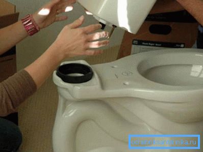 - Nastavljamo razmišljati kako instalirati toalet na pločici i sada dolazi do najvažnijeg momenta - ovo je ugradnja uređaja prema oznakama na silikonskoj zaptivnoj masi. U ovom slučaju, najverovatnije ćete morati istovremeno popraviti valovito crevo ili plastični ugao u odnosu na montažu kanalizatora, tako da je bolje to uraditi zajedno sa asistentom.