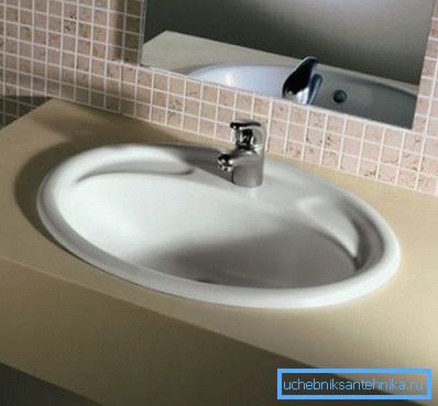 - Centralnu i vodeću poziciju u smislu broja modela i jednostavnosti ugradnje zauzima umivaonik ugrađen u gornju površinu odozgo. Takav proizvod se postavlja u posebno izrezanu nišu i blago poraste iznad nivoa stola.