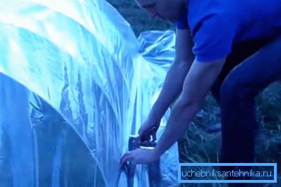 Kada je okvir spreman, možete nastaviti sa instalacijom celofanskog filma i biće mnogo bolje ako koristite jedan ceo komad - manje brige, kako na rastojanju, tako iu toku rada staklenika.