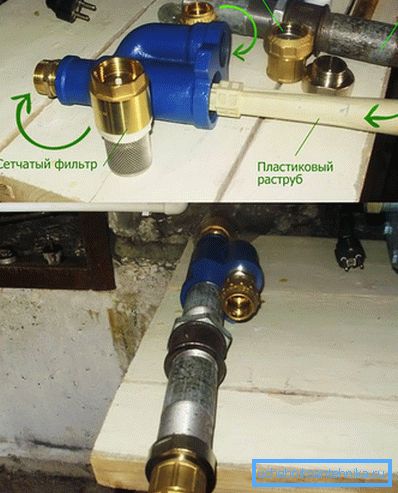 Sad možete sastaviti ejektor. Zbog toga, ugaonik (2) je usko urezan u teglu (1), tako da fiting ide 1-2 mm iznad gornje ivice bočne utičnice mina, tako da ostane najmanje četiri okreta na unutrašnjem navoju mrene, tako da se izlaz može urezati (6). Ukoliko se preostali slobodni navoj tete propusti, neophodno je odvrtati navoje sindikata, u slučaju nedostatka dužine sindikata možete staviti komad cevi na njega. Izlazom (5) kroz koji će voda biti usisana, neophodno je pričvrstiti nepovratni ventil tako da kada se sistem pokrene, voda se ne preliva iz sistema za usisavanje i recirkulacije vode, inače se sistem neće pokrenuti. Takođe morate zaptiti sve navojne spojeve sa bilo kojim zaptivnim materijalom.