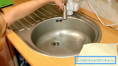 Naravno, prva stvar koju treba uraditi je da uklonite staru slavinu iz umivaonika ili sudopere i dobro obrišite sedište - tamo se, najverovatnije, krece kreč oko ivica rupe. Zatim raspakujemo grijač vode na slavinu - komplet se sastoji od glavnog mehanizma sa električnim kablom i RCD-om, izlivom (izlivom) i tehničkim pasošem.