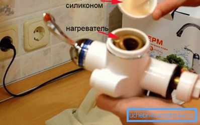 - Voda unutar mehanizma se zagreva pomoću električnog grejnog elementa, koji je označen strelicom na vrhu fotografije i zatvoren je utikačem sa silikonskim zaptivačem. U slučaju zamrzavanja vode u slavinu, silikonska zaptivka služiće kao pufer i kućište se ne razbije (ovo je vrlo pogodno za letnje kolibe u kojima ne postoji konstantno zagrevanje zgrade). Takođe, postoji zaštita od napona napona - to je zaštitni izrez ili RCD uređaj.