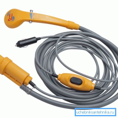 - Jedno crevo se spušta u kontejner sa vodom, na drugom se nalazi zalivanje, samo uključite sistem i možete se tuširati. Da biste izbegli praznjenje baterije, bolje je da motor radi.