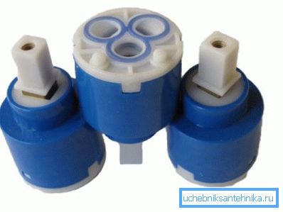 - Glavni element sistema je poseban kertridž unutar koga se pokreće keramička kugla sa tri rupa., od kojih se dve kombinuju sa dovodom topline i hladne vode, zbog čega se reguliše temperatura i pritisak, a kroz treću rupu, već mešana voda se isporučuje do glave tuša ili do izlaza miksera.