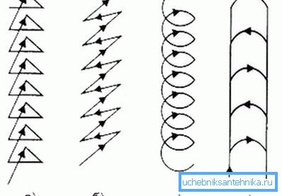 Takođe treba razmotriti i pitanje trajektorije pokreta elektrode u odnosu na liniju zavarivanja. Ovde je važno shvatiti da se u procesu rada elektroda ne pomera uvek. Na osnovu specifičnih uslova, oscilatorni pokreti u odnosu na osu elektrode (da bi se držao električni luk), trebalo bi da budu prisutne vertikalno kretanje elektrode vertikalno i oscilatorno, u obliku luka u cilju regulisanja širine šiva. Formiranje zavara se vrši kombinovanjem ovih višesmernih pokreta, koje možete videti na slici. Kao što je već pomenuto, potpuno razumevanje problema dolazi samo sa iskustvom.