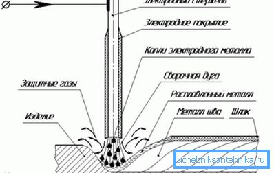 Donja linija je da se električna struja nanosi na elektrodu. U trenutku privođenja na dijelove koji se spoje, pojavljuje se električni luk, koji ima visoku temperaturu. Kao rezultat toga, metal dijelova koji se spoje i taloži elektrodni materijal. Nakon pojave luka, elektroda se mora čuvati na kratkom rastojanju od dela koji treba zavariti. U isto vrijeme, formiranje zaštitnog filma, pojavljuje se šljaka, koja se odupire predratnom i neujednačenom hlađenju zavarenog bazena. Na kraju posla, ova šljaka se oštrljava, a možete vidjeti rezultujući zavarivački šav.